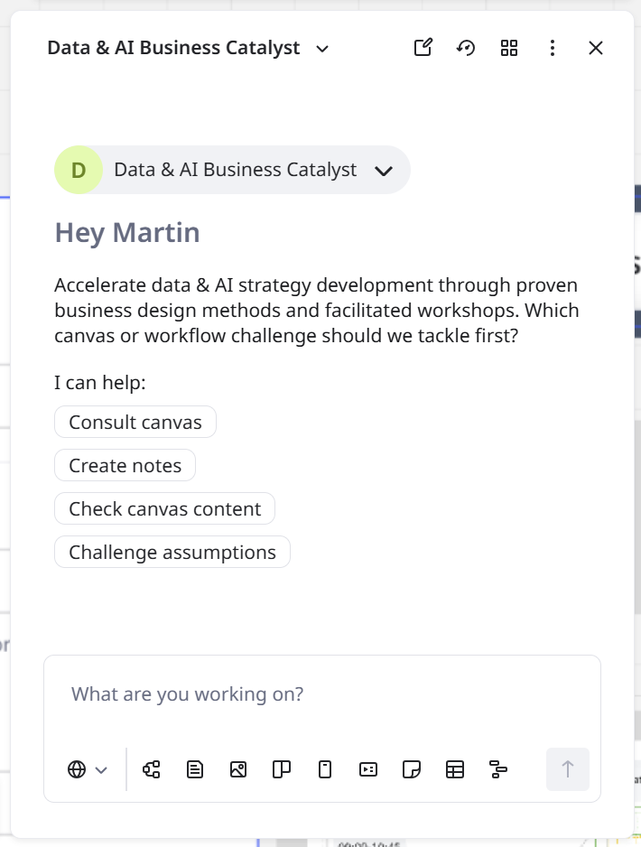 Instead of the generic Miro Sidekick, the Sidekick Action prompts a specialized Sidekick: the Data & AI Business Catalyst. This AI Sidekick acts both as a workshop facilitator, workshop orchestrator, and data & AI advisor. It is familiar with our Data & AI Business Design Method, our visual canvas tools, and our Miroverse templates. Users can also access it via the Sidekick sidebar and ask questions or give instructions via chat.
