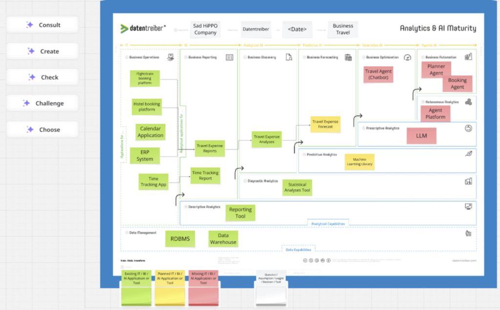 However, especially in workshops, there’s often no time for prompt & refine. Instead, it has to work at the first click of a button. That’s why there’s a predefined set of AI Action buttons for every Datentreiber canvas—that is, every phase of the workshop (Business Understanding, User Understanding, Data Understanding) is supported by the Data & AI Business Catalyst: