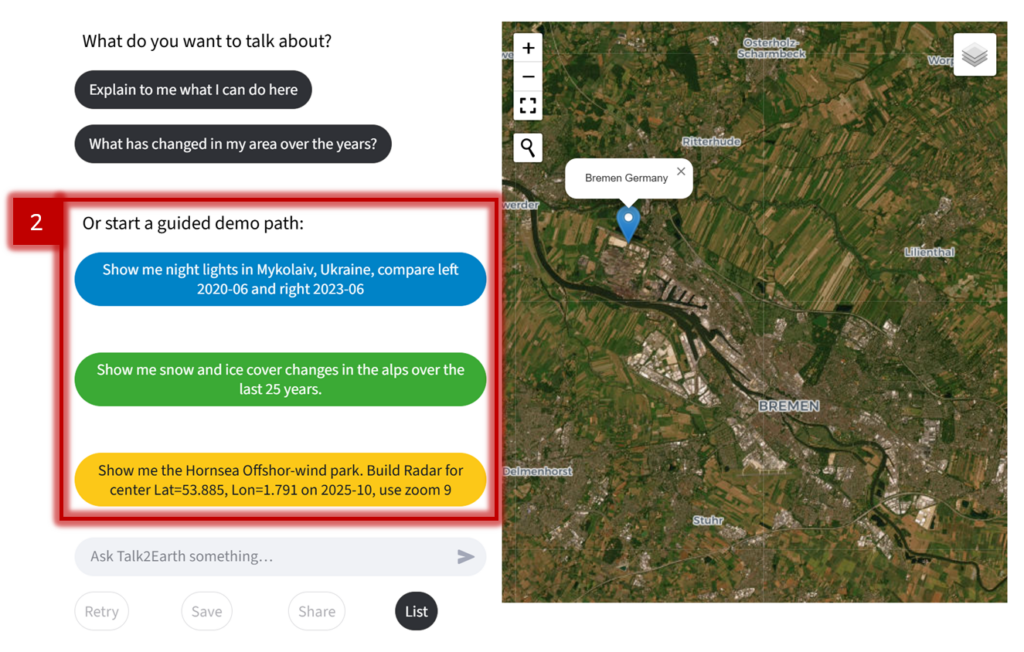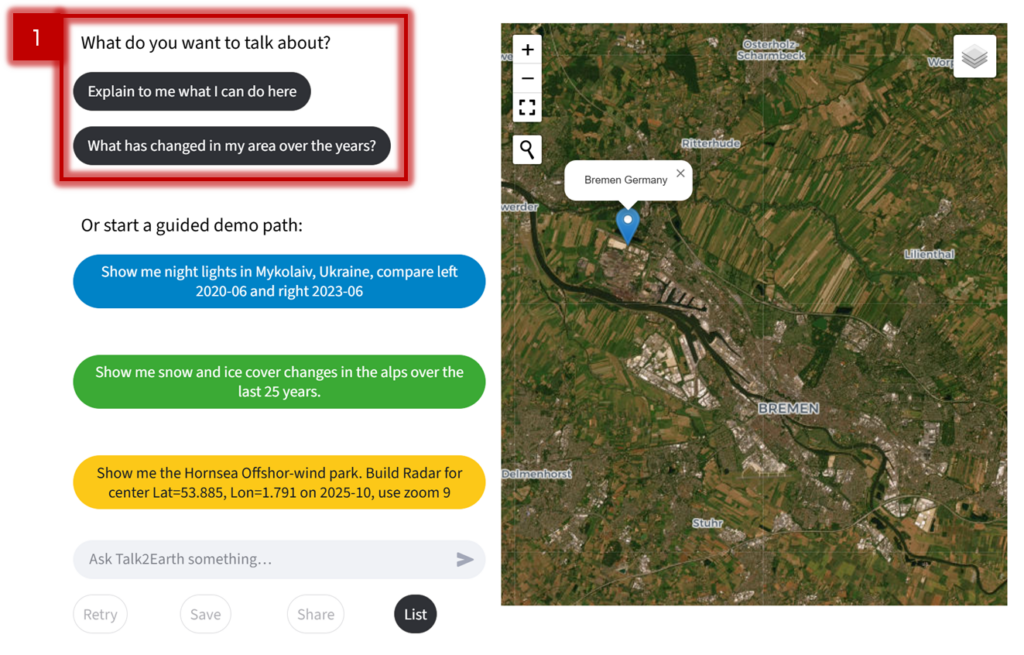Next, tell Talk2Earth what you want to see. We have also prepared some demo cases as click stories (predefined prompts so you don’t have to type) for the ESA Ministerial Council Meeting 2025 in Bremen: try one of the colored buttons (see 2️⃣ in the next image). The three colors blue, green, and yellow stand for technological, ecological, and economic use cases.
