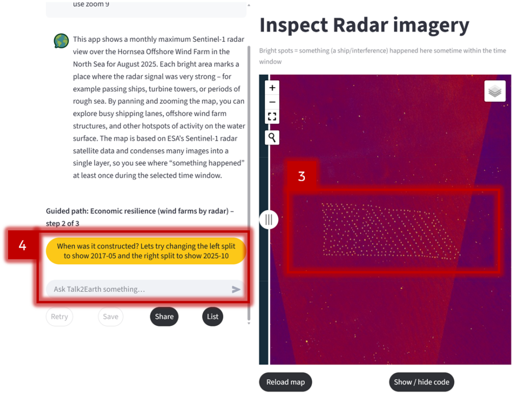 For example, if you press the yellow button, you will see radar images of the Hornsea wind farm in the North Sea. The map shows a so-called split view. You can use the slider to change the view: on the left-hand side, you will see normal images—the wind turbines are not visible there because the resolution is too low. On the right-hand side, Talk2Earth shows radar images. The wind turbines are visible there (see 3️⃣ in the image below): each dot is a wind turbine.