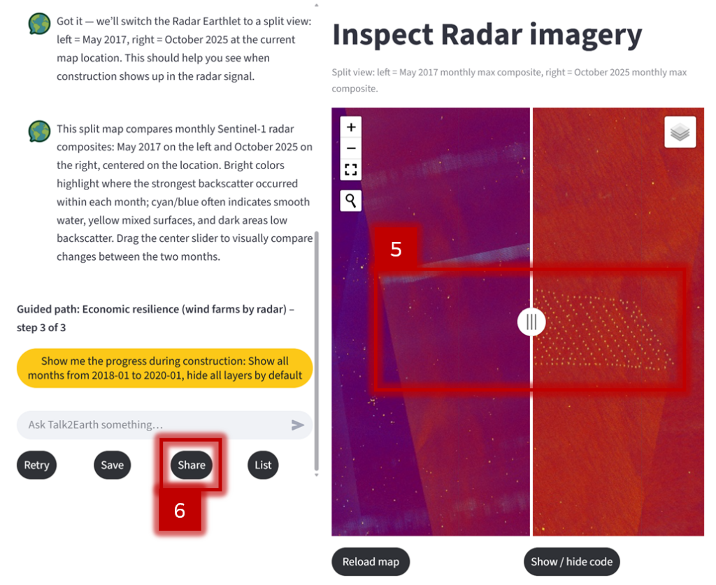 Once you are satisfied, share your Earth Intelligence solution with others as an Earthlet. Click on Share (see 6️⃣). Before doing so, you must choose a name and description for your Earthlet, for which Talk2Earth already provides a suggestion.